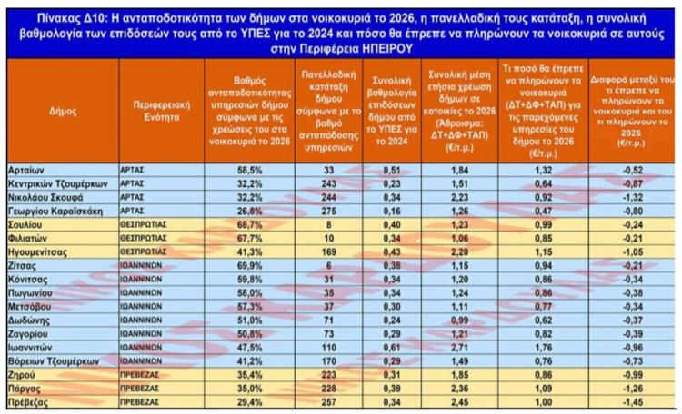 Η εικόνα που παρουσιάζουν οι 18 Δήμοι της Ηπείρου καταγράφεται στον παρακάτω πίνακα, από τον οποίο μπορούν να βγουν χρήσιμα συμπεράσματα για τις επιδόσεις τους και για το πόσο πιο ακριβά πληρώνουν οι δημότες τις προσφερόμενες υπηρεσίες.