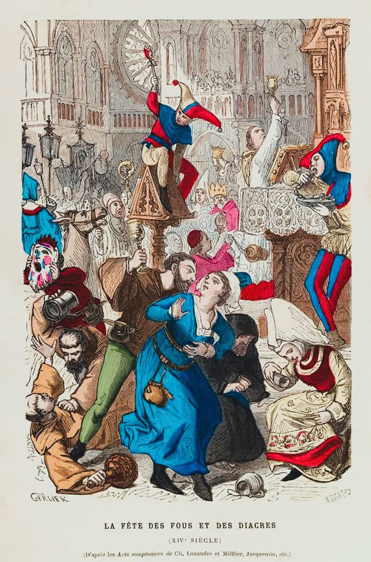 * 2η foto: Η «Γιορτή των Τρελλών» σε εικονογράφηση του 19ου αιώνα. Κατά τον Μεσαίωνα ο κατώτερος κλήρος αναλάμβανε συμβολικά την εξουσία και η λειτουργία μετατρεπόταν σε τελετουργικό γέλιο. Πηγή: Χαρακτικό 19ου αι., αναπαράσταση μεσαιωνικού εθίμου (La fête des fous et des diacres).