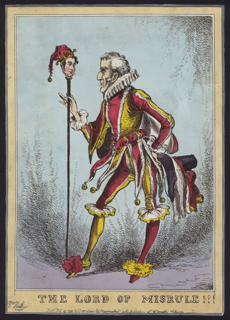 * 1η foto: Ο «Άρχοντας της Αταξίας» στις αγγλικές αυλές. Προσωρινός κυβερνήτης του γλεντιού και συγγενής των μεσαιωνικών τελετών ανατροπής που πέρασαν στο θέατρο. Πηγή: Βρετανικό χαρακτικό 18ου–19ου αιώνα.