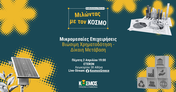 Ο ΚΟΣΜΟΣ προσκαλεί τους πολίτες, τους εκπροσώπους των φορέων συλλογικής εκπροσώπησης και τον κόσμο του επιχειρείν σε μια ανοιχτή πολιτική συζήτηση και διαβούλευση με τίτλο: «Βιώσιμη Χρηματοδότηση & Δίκαιη Μετάβαση: Από τις Ροές Κεφαλαίου στην Κοινωνική Πραγματικότητα», την Πέμπτη 2 Απριλίου, στις 19:00, στον χώρο του ETERON (Λεωκορίου 38, Αθήνα).