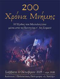 Μία ξεχωριστή δράση με τίτλο: «200 χρόνια μνήμης: Η Έξοδος του Μεσολογγίου μέσα από το πανηγύρι τ’ Άη Συμιού» παρουσιάζει η Διεύθυνση Πολιτιστικών Θεσμών, Εκδηλώσεων και Πολιτισμού του Δήμου Ιωαννιτών, το Σάββατο 4 Οκτωβρίου 2025 και ώρα 19:00, στον Πολιτιστικό Πολυχώρο «Δ. Χατζής».