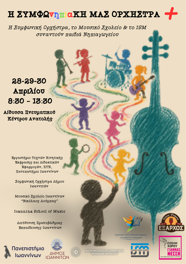 Tο Εργαστήριο Τεχνών & Διδακτικών Εφαρμογών του Παιδαγωγικού Τμήματος Νηπιαγωγών του Πανεπιστημίου Ιωαννίνων, σε συνεργασία με τη Συμφωνική Ορχήστρα του Δήμου Ιωαννιτών, τη Διεύθυνση Πρωτοβάθμιας Εκπαίδευσης Ιωαννίνων, το Μουσικό Σχολείο Ιωαννίνων και το ISM Ιωαννίνων, διοργανώνουν και παρουσιάζουν για δεύτερη συνεχόμενη χρονιά, ένα πρωτοποριακό πρόγραμμα για παιδιά νηπιαγωγείου, με τίτλο η ΣΥΜΦΩνηπιαΚΗ μας ορχήστρα+, που υλοποιείται ήδη από τον Μάρτιο σε πολλά νηπιαγωγεία της πόλης και θα κορυφωθεί σε κεντρική εκδήλωση στις 28, 29 και 30 Απριλίου 2026.