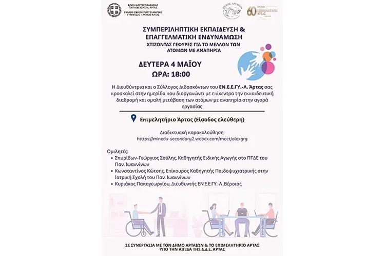 Η Διευθύντρια και ο Σύλλογος Διδασκόντων του ΕΝΕΕΓΥΛ Άρτας, σε συνεργασία με το Επιμελητήριο Άρτας και τον Δήμο Αρταίων, διοργανώνουν ημερίδα με θέμα: «Συμπεριληπτική Εκπαίδευση & Επαγγελματική Ενδυνάμωση – Χτίζοντας Γέφυρες για το Μέλλον των Ατόμων με Αναπηρία» αφιερωμένη στη Συμπεριληπτική Εκπαίδευση και την Επαγγελματική Ενδυνάμωση των Ατόμων με Αναπηρία.