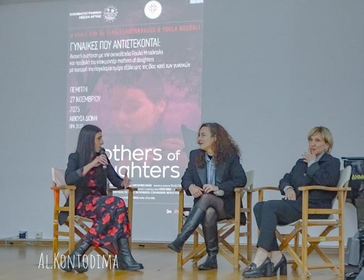 Η Δράση Γυναικών Άρτας και Κινηματογραφική λέσχη Άρτας διοργάνωσαν εκδήλωση για την παγκόσμια ημέρα εξάλειψης της βίας κατά των γυναικών και σε σχετική ανακοίνωση αναφέρουν: «Την Πέμπτη το βράδυ στη Διώνη ακούσαμε μια φωνή που μετατρέπει τον πόνο σε δύναμη.Μια μητέρα χάνει την κόρη της από γυναικοκτονία. Αντί για οργή απέναντι στον κόσμο, πενθεί με τον δικό της διαφορετικό τρόπο: βγαίνει έξω, μιλά δημόσια και αγωνίζεται να ανταλλάξει την πατριαρχία με την αγάπη για χάρη της κοινωνίας μας. Το ντοκιμαντέρ mothers of daughters συγκίνησε το κοινό και η Αλεξάνδρα Μάκου, με αφοπλιστικό τρόπο μας έδειξε μέσα από τα μάτια της και η Γιούλα Μπούνταλη μέσα από τη βαθιά συναισθηματική της προσέγγιση, τι σημαίνει δύναμη, ψυχή, θέληση.