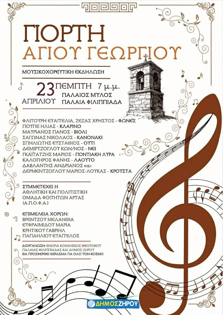 Ο Δήμος Ζηρού και ο Εκπολιτιστικός Σύλλογος Παλαιάς Φιλιππιάδας σας προσκαλούν σε δύο ξεχωριστές εκδηλώσεις με αφορμή τη γιορτή του Αγίου Γεωργίου, γεμάτες παράδοση, πίστη και πολιτισμό.
