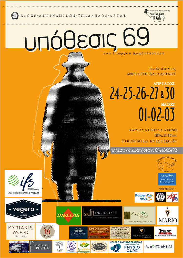 Η θεατρική ομάδα «Υπόθεσις 19» της Ένωσης Αστυνομικών Υπαλλήλων Άρτας παρουσιάζει τη νέα της θεατρική παραγωγή με τίτλο «Υπόθεσις 69» του Γιώργου Κομιτόπουλου σε σκηνοθεσία Αφροδίτη Κατσαούνου.