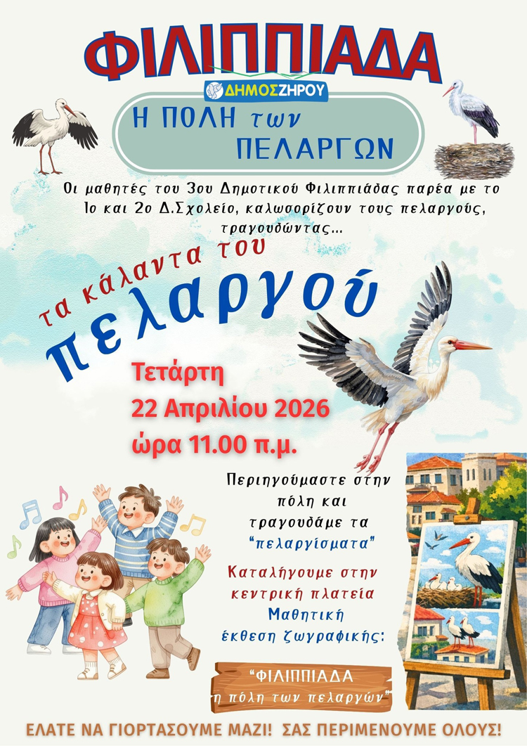Ο Δήμος μας, μαζί με τους μαθητές του 3ου Δημοτικού Σχολείου Φιλιππιάδας και σε συνεργασία με το 1ο και 2ο Δημοτικό, σας προσκαλούν σε μια ξεχωριστή, χαρούμενη δράση αφιερωμένη στην άφιξη των πελαργών στην πόλη μας!