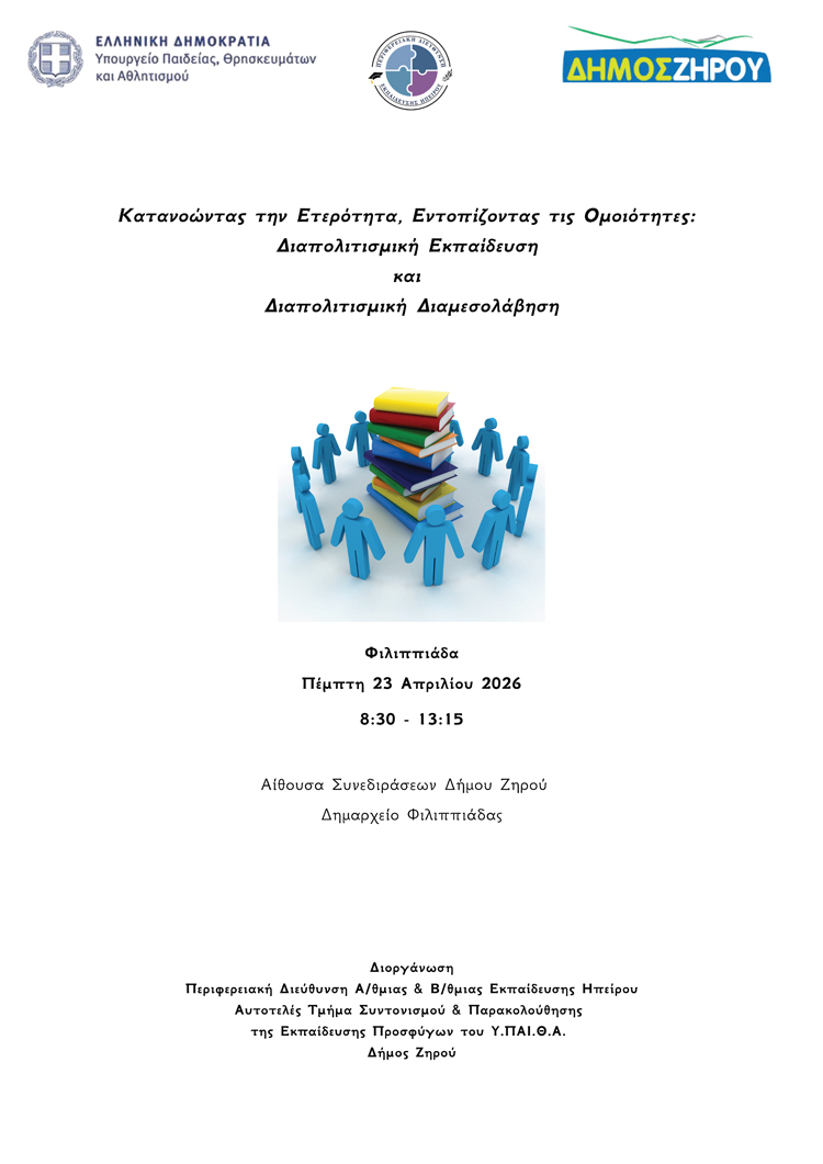 Ο Δήμος Ζηρού, σε συνεργασία με την Περιφερειακή Διεύθυνση Πρωτοβάθμιας και Δευτεροβάθμιας Εκπαίδευσης Ηπείρου και το Αυτοτελές Τμήμα Συντονισμού και Παρακολούθησης της Εκπαίδευσης Προσφύγων του Υπουργείου Παιδείας, Θρησκευμάτων και Αθλητισμού, διοργανώνουν επιμορφωτική συνάντηση με θέμα: «Κατανοώντας την Ετερότητα, Εντοπίζοντας τις Ομοιότητες: Διαπολιτισμική Εκπαίδευση και Διαπολιτισμική Διαμεσολάβηση»