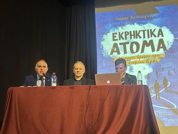 Με τεράστια επιτυχία ολοκληρώθηκε η παρουσίαση του βιβλίου του Γιώργου Κατσικογιώργου στην Πνευματική Στέγη του Μουσικοφιλολογικού Συλλόγου Άρτης “ο Σκουφάς”. Σε μια κατάμεστη αίθουσα, που αποδείχθηκε μικρή για να χωρέσει το ενδιαφέρον του κοινού, πραγματοποιήθηκε το βράδυ της Δευτέρας, 13 Απριλίου, η παρουσίαση του βιβλίου του φυσικού Γιώργου Κατσικογιώργου, με τίτλο «Εκρηκτικά Άτομα: Ο μακρύς δρόμος προς την ατομική βόμβα» (Εκδόσεις Ελληνοεκδοτική).