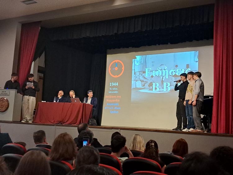 Η θεατρική απόδοση των παιδιών συνοδευόμενη από video με ιστορικά ντοκουμέντα μετέφερε με μοναδικό τρόπο στο κοινό την αγωνία και τα διλήμματα των κορυφαίων επιστημόνων της εποχής. Την ατμόσφαιρα συμπλήρωσε με απόλυτη αρμονία ο Αρτινός μουσικός Ορέστης Τσιαμπάς, ο οποίος συνόδευσε την εκδήλωση στο πιάνο.