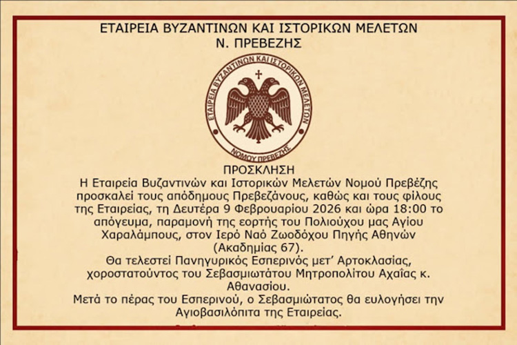 Η Εταιρεία Βυζαντινών και Ιστορικών Μελετών Νομού Πρεβέζης θα τιμήσει και φέτος τη μνήμη του Αγίου Χαραλάμπους, Πολιούχου και Προστάτη της Πρέβεζας, με την τέλεση Πανηγυρικού Εσπερινού στην Αθήνα.
