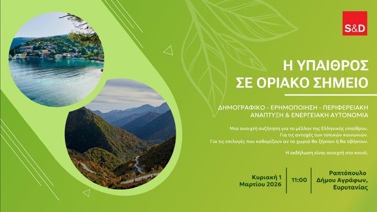 Η Ομάδα των Σοσιαλιστών & Δημοκρατών στο Ευρωπαϊκό Κοινοβούλιο και ο ευρωβουλευτής του ΠΑΣΟΚ – S&D Σάκης Αρναούτογλου διοργανώνουν την Κυριακή 1 Μαρτίου 2026, στις 11:00, στο Ραπτόπουλο Ευρυτανίας (Δήμος Αγράφων) εκδήλωση με θέμα: