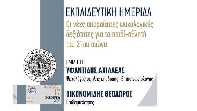 Με μεγάλη επιτυχία πραγματοποιήθηκε την Παρασκευή 17 Οκτωβρίου 2025, ημερίδα με τίτλο: «Οι νέες απαραίτητες ψυχολογικές δεξιότητες για το παιδί-αθλητή του 21ου αιώνα», που διοργάνωσε ο «Γ.Α.Σ.» Γυμναστικός Αθλητικός Σύλλογος Αναγέννηση Άρτας, στην οποία συμμετείχε έπειτα από πρόσκληση και το Κέντρο Πρόληψης των Εξαρτήσεων & Προαγωγής της Ψυχοκοινωνικής Υγείας Ν. Άρτας «Κ.Π.Ν.ΑΡΤΑΣ».