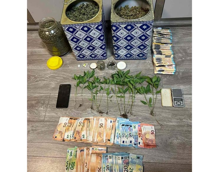 Στο πλαίσιο των ερευνών που πραγματοποιήθηκαν στις κατοικίες όλων των συλληφθέντων εντοπίστηκαν μία καλλιέργεια εσωτερικού και μία εξωτερικού χώρου φυτών κάνναβης, ενώ βρέθηκαν συνολικά και κατασχέθηκαν: