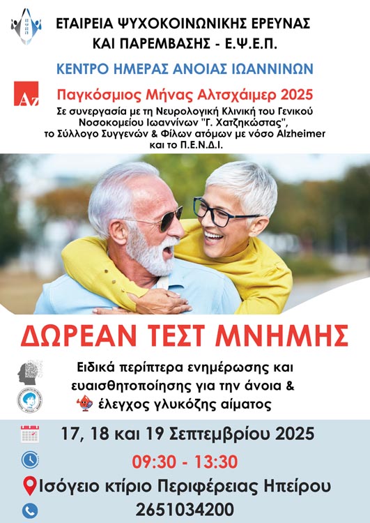 Με διαρκή στόχο την υποστήριξη της κοινότητας μέσα από την ενημέρωση, την ευαισθητοποίηση και τις δράσεις πρόληψης για την άνοια, το Κέντρο Ημέρας Άνοιας Ιωαννίνων της Εταιρείας Ψυχοκοινωνικής Έρευνας και Παρέμβασης – Ε.Ψ.Ε.Π συνεχίζει τις δράσεις για τον Παγκόσμιο Μήνα Alzheimer.Στο πλαίσιο αυτό, σε συνεργασία με το Νευρολογικό Τμήμα του Γενικού Νοσοκομείου «Χατζηκώστα» Ιωαννίνων, την Πανηπειρωτική Ένωση για το Νεανικό Διαβήτη (Π.Ε.Ν.ΔΙ.) και τον Σύλλογο Συγγενών και Φίλων Ατόμων με Alzheimer και Συναφείς Διαταραχές Νομού Ιωαννίνων, θα πραγματοποιηθείτριήμερη δράση για δωρεάν προληπτικό έλεγχο μνήμης και ενημέρωση του κοινού σχετικά με την άνοια.