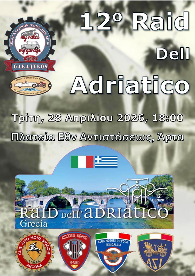 Η Λέσχη Κλασικών Οχημάτων Άρτας, μέλος της Ε.Ο. ΦΙΛΠΑ, έχει την ιδιαίτερη χαρά και τιμή να ανακοινώσει τη φιλοξενία του 12ου «RaidDell’Adriatico», μιας διεθνούς διοργάνωσης ιστορικών οχημάτων με αφετηρία τη γειτονική Ιταλία.