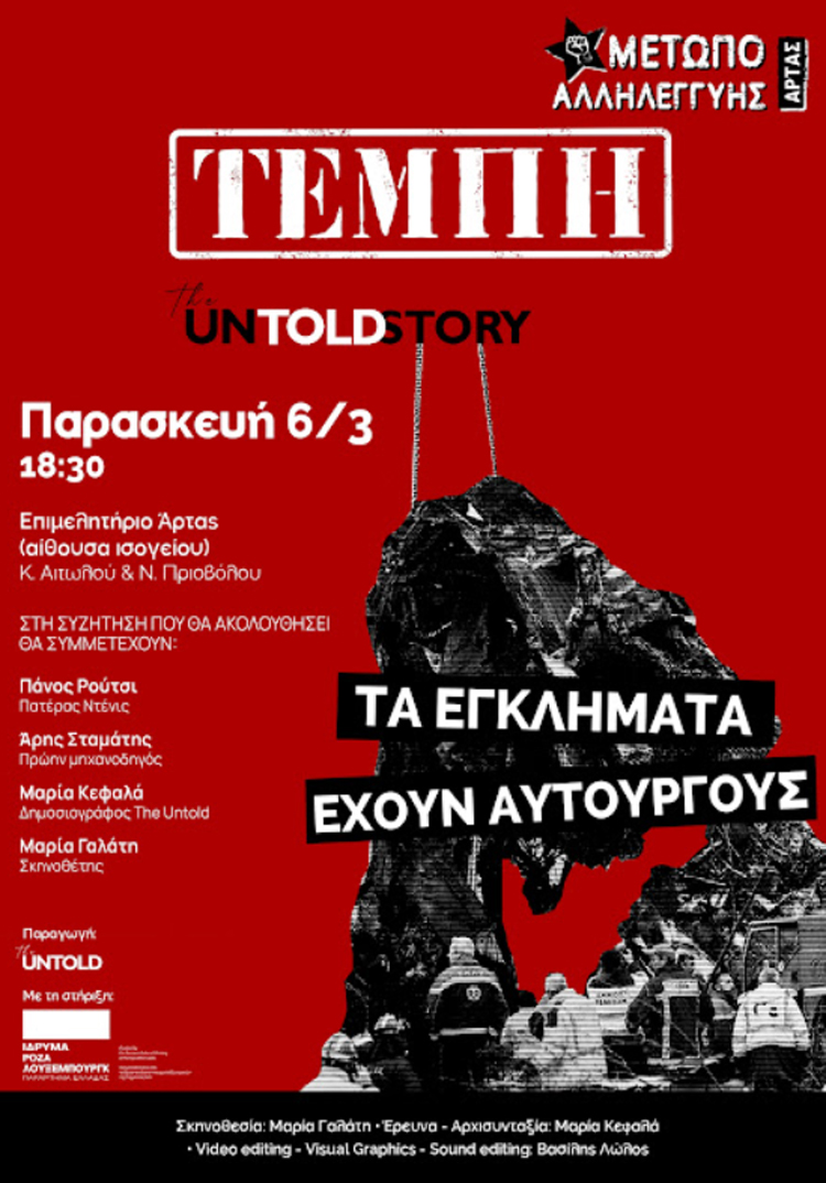 Την Παρασκευή 6 Μαρτίου 2026, στις 6:30 το απόγεμα στο Επιμελητήριο Άρτας, το Μέτωπο Αλληλεγγύης Άρτας διοργανώνει εκδήλωση συζήτηση και προβολή του ντοκιμαντέρ ΤΕΜΠΗ: The UnTOLD Stories με ομιλητές τους: