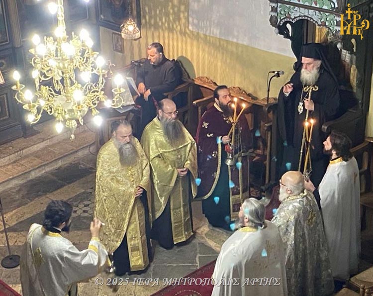 Την Πέμπτη 11 Δεκεμβρίου 2025, το απόγευμα, στον πανηγυρίζοντα Ιερό Ναό του Αγίου Σπυρίδωνος, στην πόλη της Άρτας, ετελέσθη ο πανηγυρικός Εσπερινός προς τιμήν του θαυματουργού Αγίου. Χοροστάτησε ο Σεβασμιώτατος Μητροπολίτης Άρτης κ. Καλλίνικος, πλαισιωμένος από Κληρικούς και πιστούς, που με ευλάβεια, προσήλθαν στον ναό για να τιμήσουν τη μνήμη του Αγίου, παρακαλώντας για τη μεσιτεία και την ευλογία του στη ζωή τους.