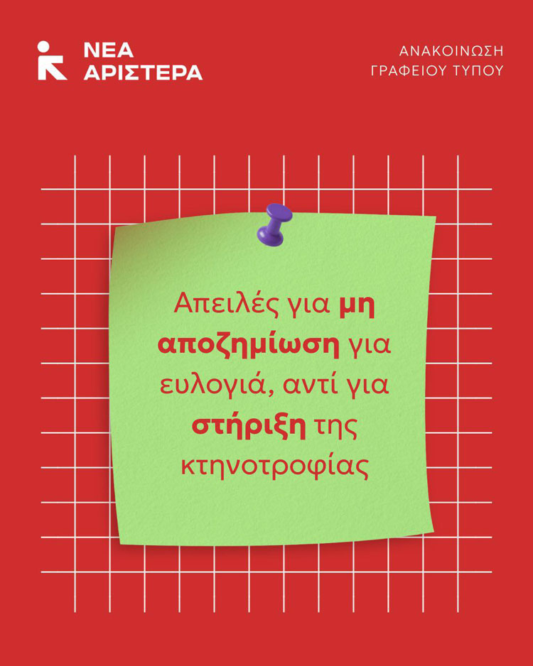 Σε ανακοίνωσή της η Νέα Αριστερά σημειώνει πως σύμφωνα με πρόσφατα δημοσιεύματα, το Υπουργείο Αγροτικής Ανάπτυξης και Τροφίμων, ζητά από τις Περιφέρειες να καταγράψουν τις κτηνοτροφικές εκτροφές που διαθέτουν περίφραξη και απολυμαντική τάφρο, μετά την ολοκλήρωση της καταγραφής θα δοθεί προθεσμία μόλις 10 έως 15 ημερών στους παραγωγούς για να κατασκευάσουν περίφραξη και απολυμαντικές τάφρους, ενώ παράλληλα θα ξεκινήσουν έλεγχοι ακόμη και στα τιμολόγια αγοράς απολυμαντικών ουσιών. Μάλιστα, σε περίπτωση εμφάνισης κρούσματος ευλογιάς σε εκτροφή που δεν διαθέτει τα συγκεκριμένα μέτρα, οι κτηνοτρόφοι κινδυνεύουν να μην αποζημιωθούν για τη θανάτωση των ζώων και την απώλεια εισοδήματος.