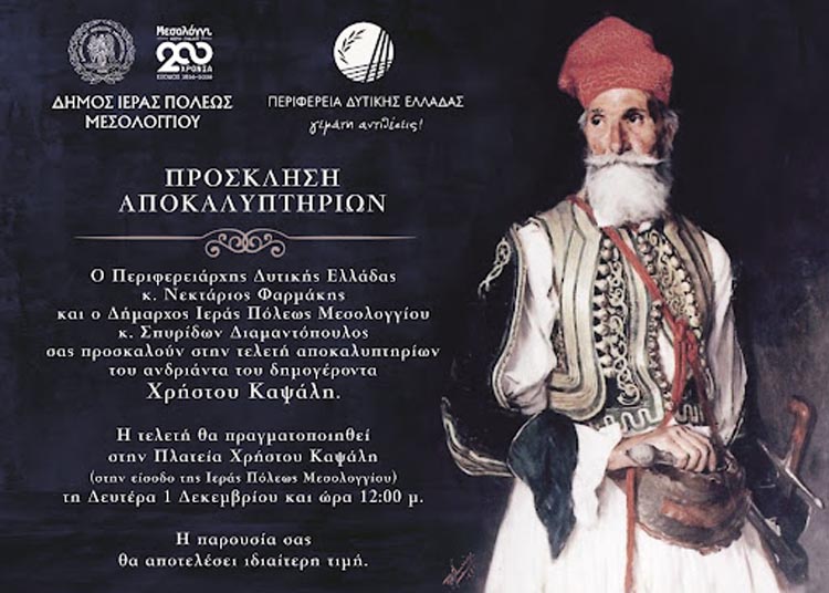 Ο Δήμος Ιεράς Πόλεως Μεσολογγίου διοργανώνει εκ νέου την τελετή αποκαλυπτηρίων του αγάλματος του Δημογέροντα Χρήστου Καψάλη, έργο του γλύπτη Ευάγγελου Τύμπα, την Δευτέρα, 1η Δεκεμβρίου 2025, στις 12:00, στην πλατεία στην είσοδο της πόλεως, έμπροσθεν της Πύλης.