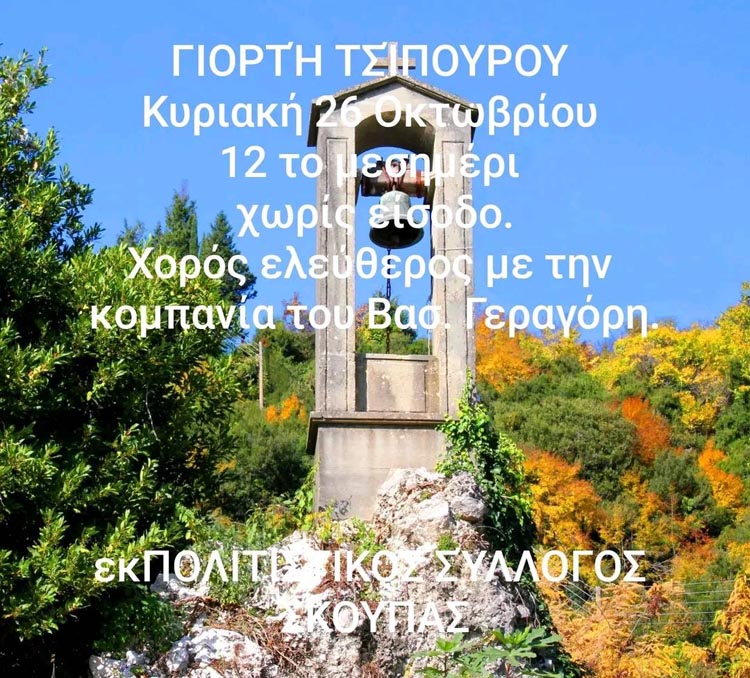 Από τα πιο όμορφα χωριά του ορεινού όγκου του Δήμου Αρταίων η Σκούπα Άρτας. Την Κυριακή 26 Οκτωβρίου 2025 ο Σύλλογος διοργανώνει γιορτή τσίπουρου. Χορός με τον Βασίλη Γεραγόρη και την κομπανία του.