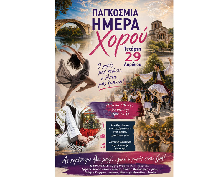 Την Παγκόσμια Ημέρα Χορού, την Τετάρτη 29 Απριλίου και ώρα 20:15, στην Πλατεία Εθνικής Αντίστασης, θα γιορτάσει ο Δήμος Αρταίων, σε μια βραδιά αφιερωμένη στη δύναμη του χορού που ενώνει ανθρώπους και πολιτισμούς.