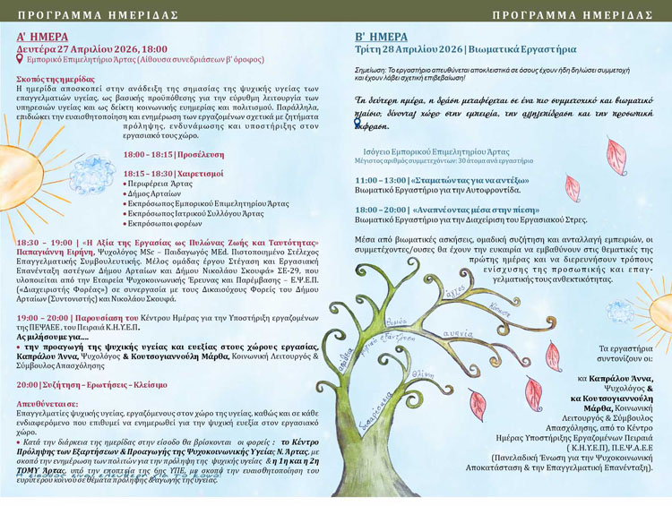 Tο Οικοτροφείο «Αίολος» της Ε.Ψ.Ε.Π.,σε συνεργασία με το Κέντρο Ημέρας Υποστήριξης Εργαζομένων Πειραιά (Κ.Η.Υ.Ε.Π.) της ΠΕΨΑΕΕ, διοργανώνουν διήμερη εκδήλωση 27 και 28 Απριλίου 2026, για την ψυχική υγεία με τίτλο: «Η ψυχή πίσω από το πρόσωπο – Όταν ο φροντιστής χρειάζεται φροντίδα».