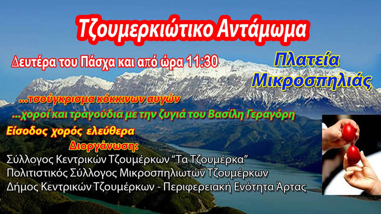 Με το τσούγκρισμα κόκκινων αυγών, με παραδοσιακούς χορούς και τραγούδια από την ζυγιά του Βασίλη Γεραγόρη. Την Δευτέρα του Πάσχα, 13 Απριλίου 2026, και από ώρα 11.30 το πρωί , στην Κεντρική Πλατεία της Μικροσπηλιάς , του Δήμου Κεντρικών Τζουμέρκων .