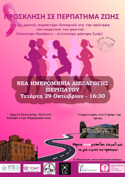 Λόγω των καιρικών συνθηκών, η προγραμματισμένη εκδήλωση ( για Τετάρτη 22 Οκτωβρίου), αναβάλλεται και θα πραγματοποιηθεί την Τετάρτη 29 Οκτωβρίου 2025, στις 16:30, με εκκίνηση από το ίδιο σημείο — την Πλατεία Σκουφά (Παρηγορήτισσα). Για 2η συνεχόμενη χρονιά, στο πλαίσιο του «Ροζ Οκτώβρη», Μήνα Πρόληψης και Ευαισθητοποίησης για τον Καρκίνο του Μαστού, οι Κοινωνικές Δομές του Δήμου Αρταίων, η 1η και 2η Τοπική Μονάδα Υγείας Άρτας, σε συνεργασία με τον Σύλλογο Δρομέων Άρτας, συνδιοργανώνουν συμβολικό δυναμικό περίπατο με μήνυμα ζωής και πρόληψης.