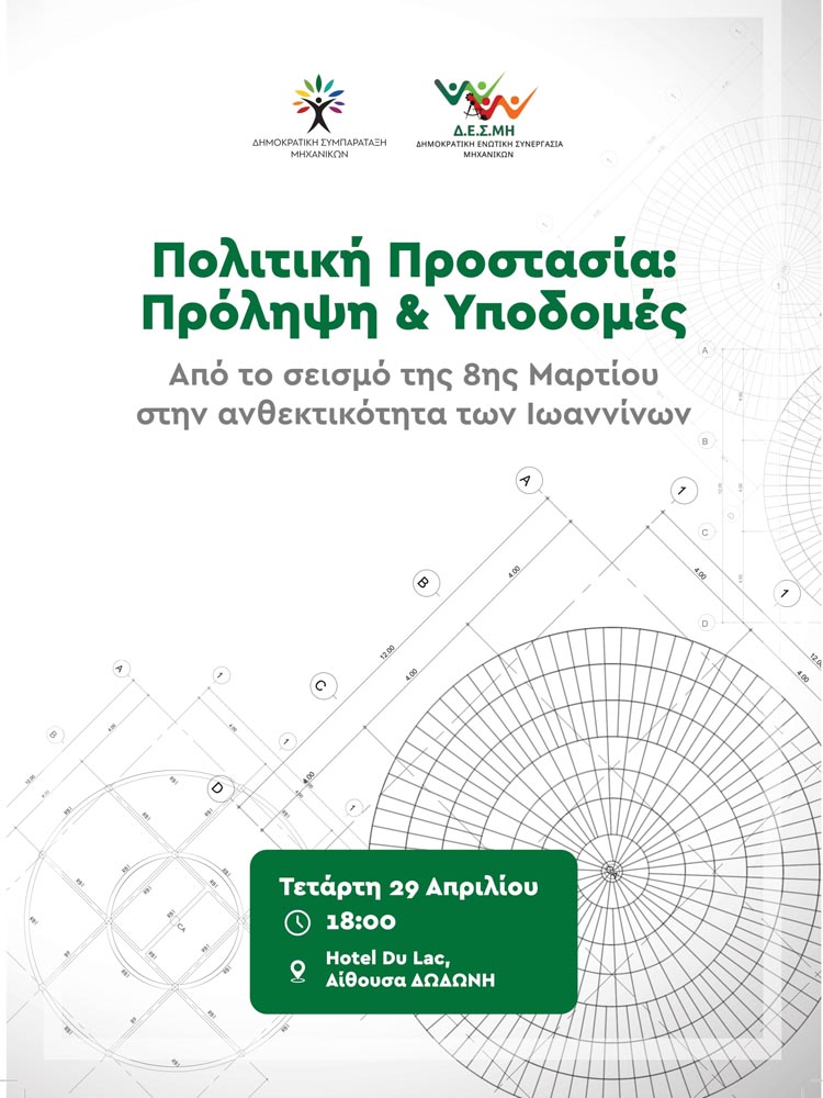 Η Δημοκρατική Ενωτική Συνεργασία Μηχανικών Ηπείρου – Λευκάδας (Δ.Ε.Σ.ΜΗ.) και η Δημοκρατική Συμπαράταξη Μηχανικών (ΔΗ.ΣΥ.Μ.) διοργανώνουν από κοινού την Τετάρτη 29 Απριλίου και ώρα 18:00,