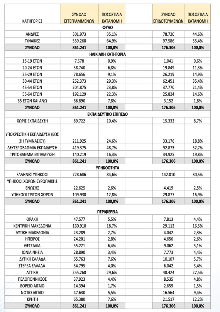 Το σύνολο των επιδοτούμενων ανέργων , για τον μήναΜάρτιο2026, (αφορά τον αριθμό των δικαιούχων που πληρώθηκαν εντός του αντίστοιχου μήνα) ανέρχεται σε 176.306 άτομα, από τα οποία οι 121.528 (ποσοστό 68,9%) είναι κοινοί άνεργοι και λοιπές κατηγορίες επιδοτούμενων ανέργων και οι54.778 (ποσοστό 31,1%) είναι εποχικοί τουριστικών επαγγελμάτων. Οι άνδρες ανέρχονται σε 78.720 (ποσοστό 44,6%) και οι γυναίκες σε 97.586 (ποσοστό 55,4%).