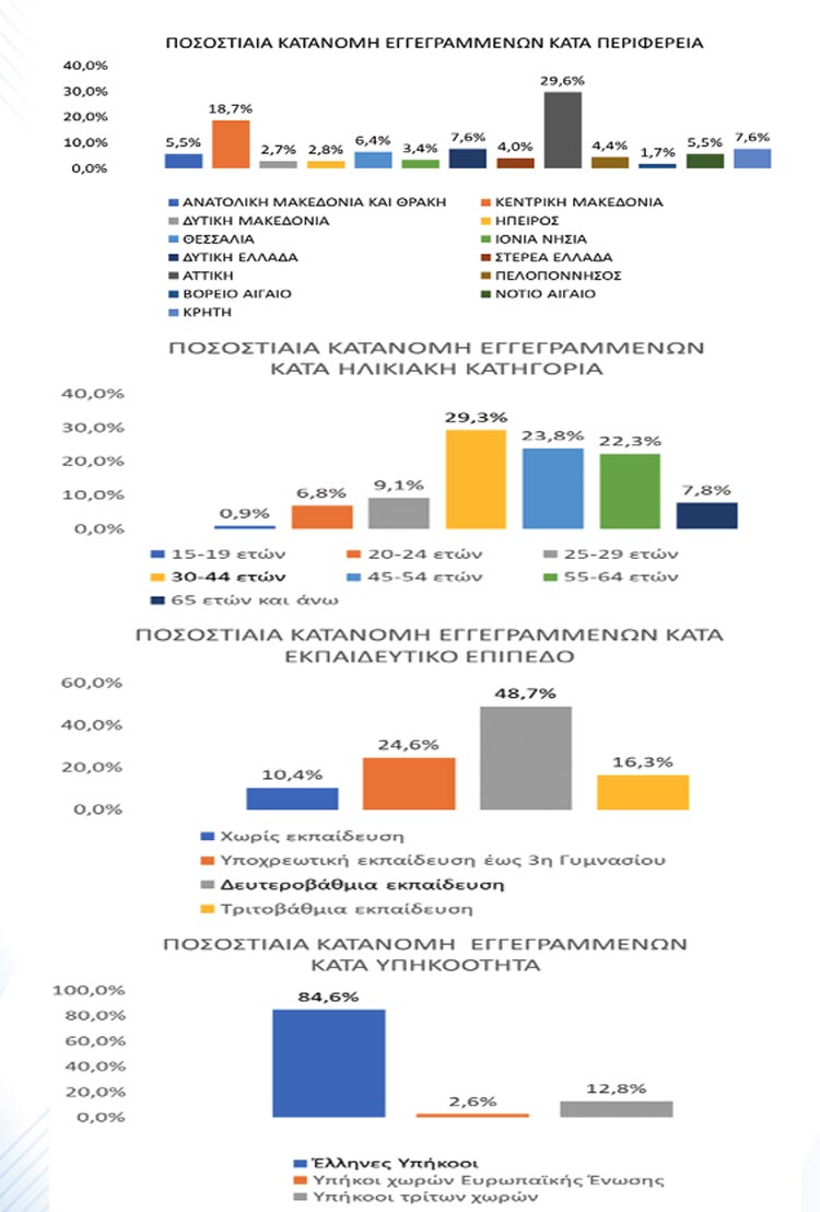 -Η ηλικιακή κατηγορία 30-44 ετών συγκεντρώνει τον μεγαλύτερο αριθμό εγγεγραμμένων μεταξύ των ηλικιακών κατηγοριών ο οποίος ανέρχεται σε 252.373 άτομα (ποσοστό 29,3%).