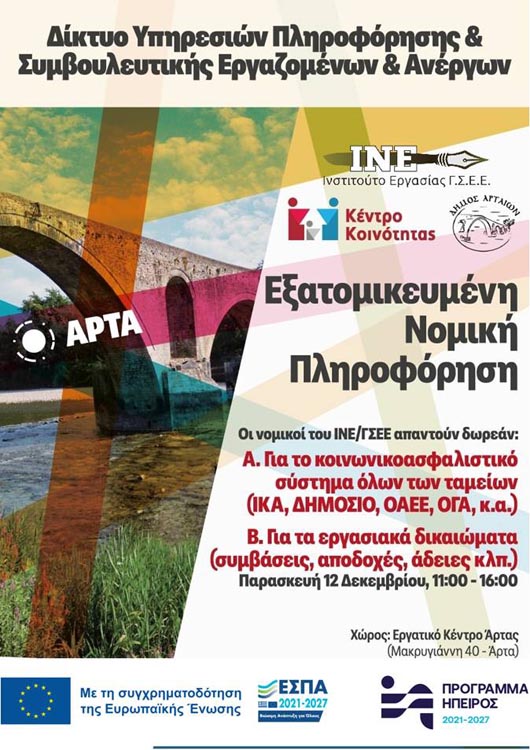 To INE ΓΣΕΕ σε συνεργασία με το Δήμο Αρταίων και το Κέντρο Κοινότητας με Παράρτημα Ρομά διοργανώνουν εκδήλωση δια ζώσης πληροφόρησης, όπου θα παρέχονται δωρεάν εξατομικευμένες υπηρεσίες νομικής πληροφόρησης.