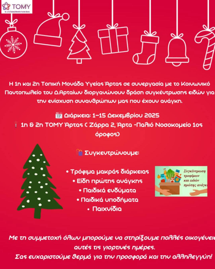 Δράση συγκέντρωσης ειδών που πραγματοποιούν η 1η και 2η Τοπική Μονάδα Υγείας Άρτας ,σε συνεργασία με το Κοινωνικό Παντοπωλείο του Δ.Αρταίων.