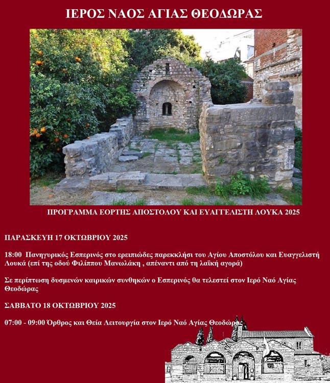 ΠΑΡΑΣΚΕΥΗ 17 ΟΚΤΩΒΡΙΟΥ 18:00 Πανηγυρικός Εσπερινός στο ερειπιώδες παρεκκλήσι του Αγίου Αποστόλου και Ευαγγελιστή Λουκά (επί της οδού Φιλίππου Μανωλάκη , απέναντι από τη λαϊκή αγορά). Σε περίπτωση δυσμενών καιρικών συνθηκών ο Εσπερινός θα τελεστεί στον Ιερό Ναό Αγίας Θεοδώρας