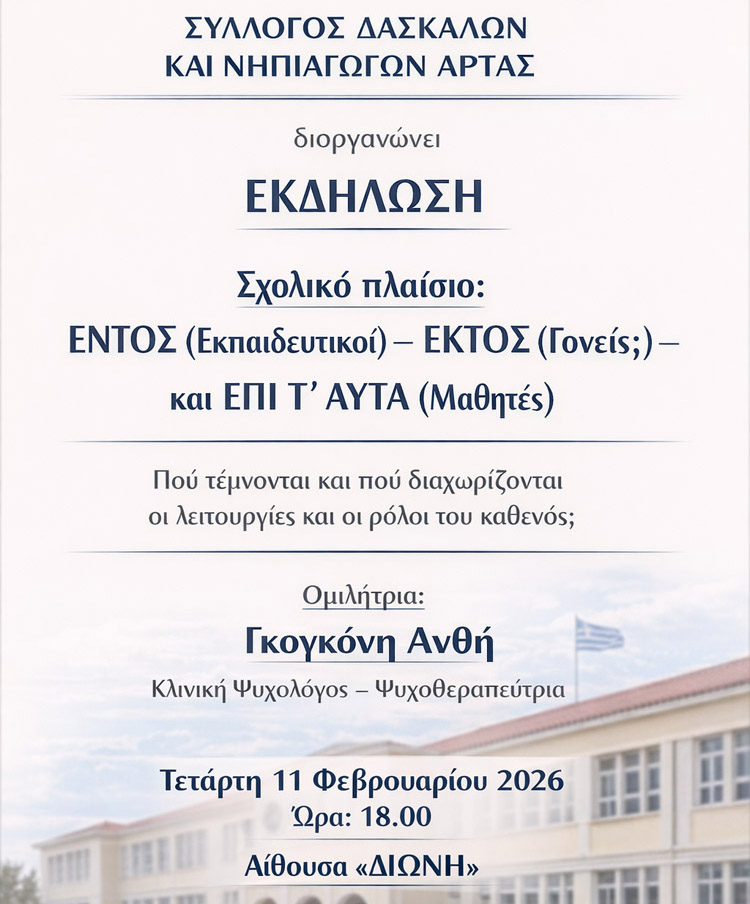 Η εκδήλωση με τίτλο «Σχολικό πλαίσιο: ΕΝΤΟΣ (Εκπαιδευτικοί) –ΕΚΤΟΣ (Γονείς;) και ΕΠΙ Τ’ ΑΥΤΑ (Μαθητές).Πού τέμνονται και πού διαχωρίζονται οι λειτουργίες και οι ρόλοι του καθενός;» θα πραγματοποιηθεί την Τετάρτη 11 Φεβρουαρίου 2026, ώρα 18.00, στην Αίθουσα «ΔΙΩΝΗ» του Εκθεσιακού Κέντρου Άρτας.