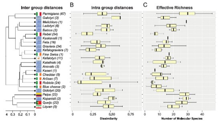 Παρατηρήθηκαν στατιστικά σημαντικές διαφορές στη βιοποικιλότητα μεταξύ των ομάδων, με την πρώτη να εμφανίζει τη μεγαλύτερη μικροβιακή ποικιλότητα. Εμβληματικές οικογένειες για την τυροκόμηση, όπως οι Lactobacillaceae και Streptococcaceae, διέφεραν σημαντικά ως προς τη σχετική τους αφθονία. Ενδιαφέρον παρουσιάζει ότι ορισμένα τυριά, όπως το κεφαλοτύρι και η παρμεζάνα, κατατάσσονται αποκλειστικά σε μία ομάδα, ενώ άλλα, όπως η φέτα και η γραβιέρα, εμφάνιζαν μικροβιακή ευελιξία και κατατάσσονται σε περισσότερες από μία. Ακόμη πιο εντυπωσιακό είναι ότι τυριά με διαφορετική υφή, γεύση και τεχνολογία παραγωγής μπορούσαν να ανήκουν στην ίδια μικροβιακή ομάδα, γεγονός που δείχνει ότι το μικροβίωμα υπερβαίνει τις κλασικές τεχνολογικές και γεωγραφικές κατηγοριοποιήσεις.