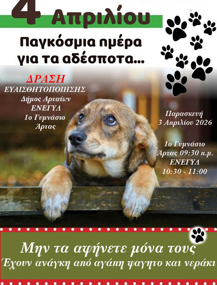 Με αφορμή την Παγκόσμια Ημέρα Αδέσποτων Ζώων, ο Δήμος Αρταίων σε συνεργασία με τον ΕΝΕΓΥΛ και το 1ο Γυμνάσιο Άρτας διοργανώνει δράσεις ενημέρωσης και ευαισθητοποίησης για τη φιλοζωία και την υπεύθυνη κηδεμονία ζώων συντροφιάς.