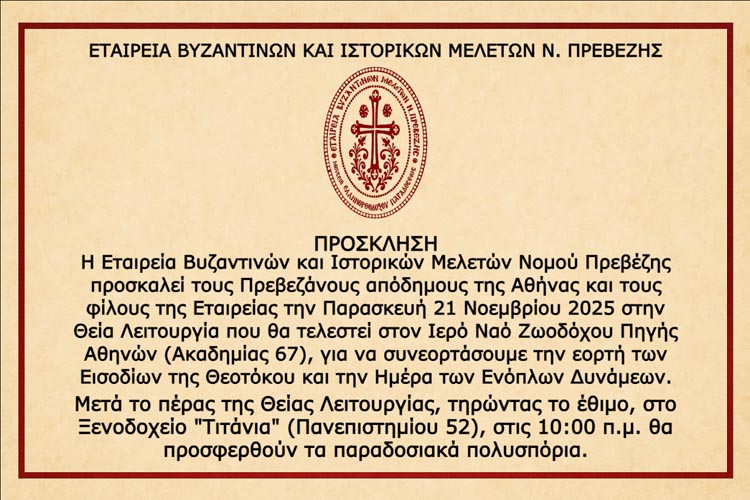 Η Εταιρεία Βυζαντινών και Ιστορικών Μελετών Νομού Πρεβέζης, συνεχίζοντας το έθιμο με τα «Πολυσπόρια», που τηρείται ακόμη στην Πρέβεζα και στα χωριά της, απευθύνει πρόσκληση προς τους Πρεβεζάνους απόδημους της Αθήνας και τους φίλους της Εταιρείας να συνεορτάσουν όλοι μαζί την εορτή των Εισοδίων της Θεοτόκου και την Ημέρα των Ενόπλων Δυνάμεων.